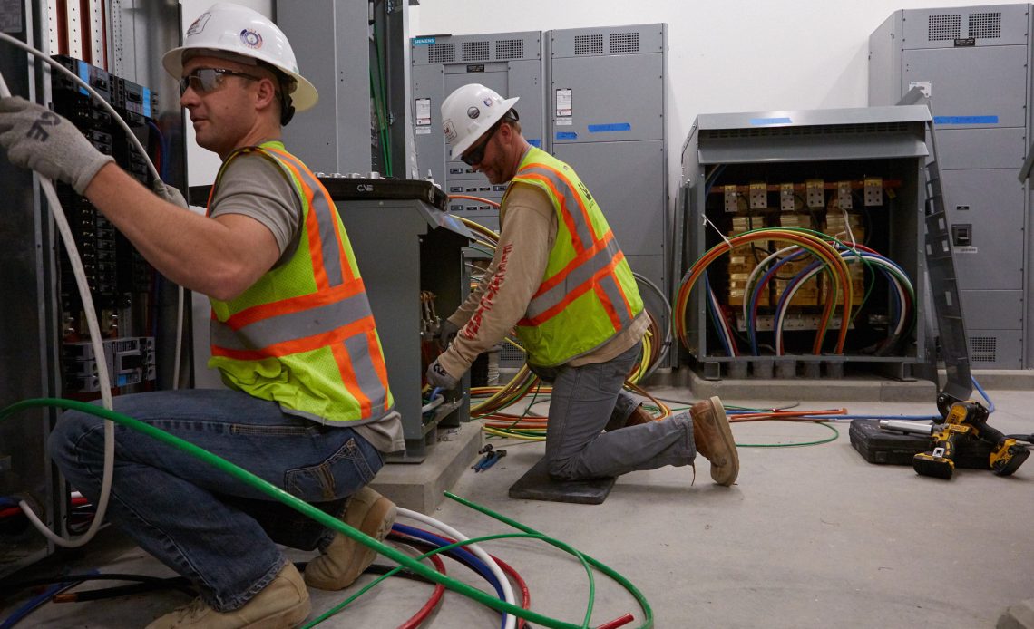 Site work progresses in coordinated phases. Initial rough-in precedes the arrival of major equipment. Electricians route conductors through trays and conduits while observing proper support spacing and bend restrictions.